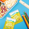 YumEarth Jelly Beans packs in yellow beside a lunch tray and colored pencils, with a “Classroom-safe treats!” label